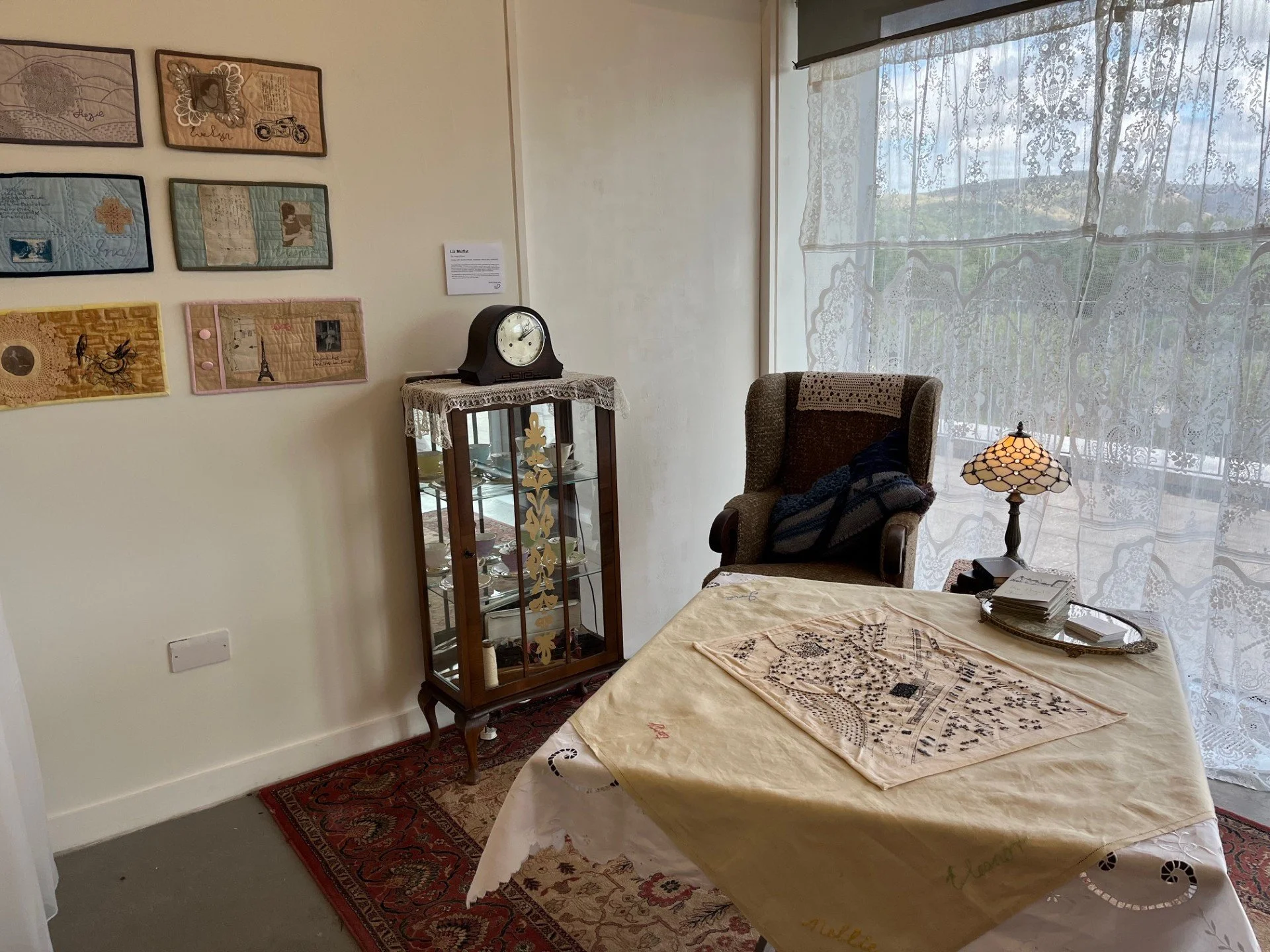 I created a setting for my art work putting the ‘pages’ of the book on the wall and the map of Deanston on top of the embroidered vintage tablecloth.