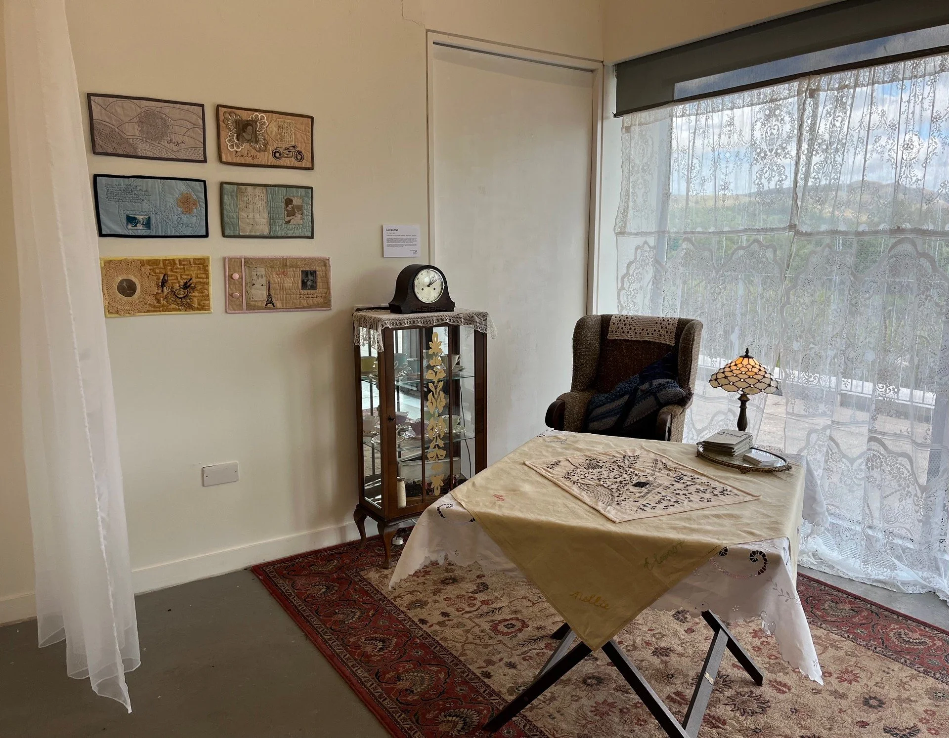 Using vintage threads and materials, a tablecloth has been repurposed into something new and meaningful. Reviving the lives of a group of women; friends and relatives who are no longer here through memories, text and stitch.