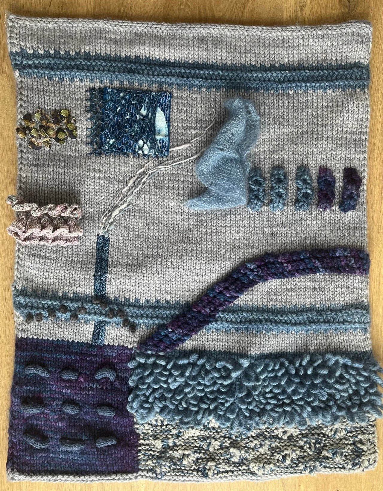 Weaving Stories is based on a conversation with my mother the year before she died. I found the notebook I had used on my weekly visits recently and remembered the happy Saturdays we spent reminiscing. She, my father and their siblings all worked in the mills in and around Galashiels and stories she told were entertaining and colourful as the Tweed they produced. The monotone colour of the knitted artwork is based around the colour of my mother’s wedding china.